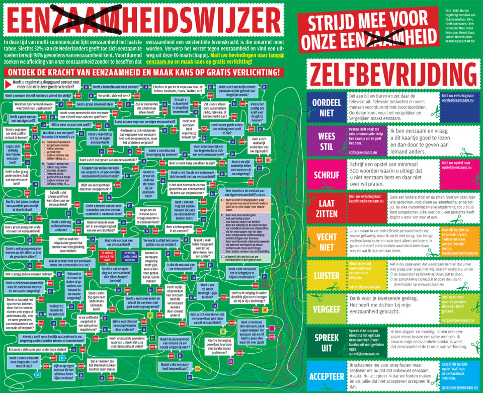 Voor Eenzaamheid is met zijn projecten een bron van inspiratie. Dit platform zet zijn antenne uit naar nieuws en achtergrond over eenzaamheid. We nodigen iedereen uit om met ideeën te komen, verrassende projecten te ontwerpen en samen met ons vorm te geven aan nieuwe betekenissen van eenzaamheid.